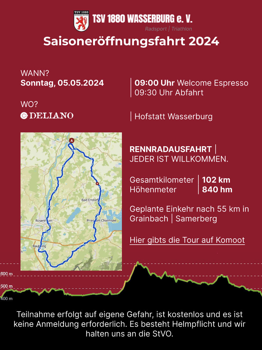 Zum Saisonabschluss veranstaltet die Triathlon und Radsportabteilung des TSV Wasserburg am Sonntag, den 06.10.2024 eine gemeinsame Ausfahrt, bei der auch Nichtmitglieder herzlich willkommen sind.