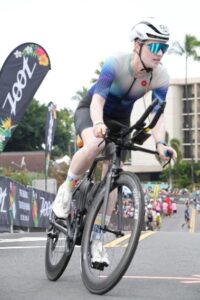 Und dann war auch schon der Renntag da. Morgens dann noch ein ausgiebiges, kohlehydratreiches Frühstück, Anbringen der Startnummern-Tattoos und dann ab in die Wechselzone. Dort angekommen wurden alle Athletinnen (ja nur Frauen, da in diesem Jahr die Weltmeisterschaften der Männer in Nizza stattfand; ab 2026 werden alle Geschlechter wieder zusammen auf Hawaii starten) von sehr freundlichen Helferinnen und Helfern begrüßt, das Fahrrad nochmal aufgepumpt und den Start der Profi-Athletinnen verfolgt. Der Startschuss meiner Altersklasse ging um 7:30, also eine Stunde nach den Profis. Nach einem Regenschauer am Morgen aber einem ansonsten trockenen Tag, war zu erwarten, dass es ein ziemlich schwüler Tag werden würde. Doch zunächst ging es in das doch verhältnismäßig wellige Wasser. Wie schon an den Schwimmzeiten bei den Profis zu erkennen, waren die Bedingungen an diesem Tag nicht leicht. Dann ging die Kanone und gemeinsamen mit den anderen WM-Teilnehmerinnen der Altersklasse 25 und 18 startete unser längster Tag des Jahres. Ein absolutes Highlight war dann, dass wieder eine Delfinschule in der Bucht von Kailua-Kona unterwegs war und mehrmals sind welche unter mir hergeschwommen sind.