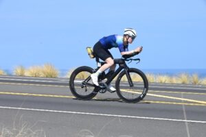 Nach knapp 70 Minuten ging es dann raus aus dem Pazifik und ab auf das Rad. Rauf auf der Palani Road und dann 90km auf dem Queen Kaahumanu Highway entlang der Küste und durch Lavafelder, bis zum Wendepunkt in Hawi und dann wieder 90km zurück. Die knapp 1.300 Höhenmeter klingen noch sehr einfach, jedoch sind die wahre Herausforderung die sogenannten „Mumuku Winde“. Diese sorgen insbesondere auf dem Rückweg dafür, dass es deutlich schwieriger ist die Aeroposition zu halten. Das wichtigste auf dem Rad ist dann, dass man nicht überhitzt, denn es gibt kein einziges Mal Schatten. Also hab ich mir bei jeder Verpflegungsstation, ca. alle 20 bis 30km, kühles Wasser einmal komplett über geschüttet. Außerdem ist eine ausreichende Versorgung mit Elektrolyten, in Form von Salztabletten, und Kohlenhydraten wichtig.